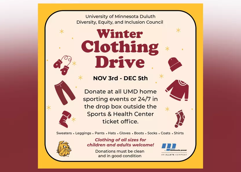 The University of Minnesota Duluth Athletics Diversity, Equity and Inclusion (DEI) Council, in collaboration with the UMD Student-Athlete Advisory Committee (SAAC), the UMD Black Men Serving Excellence (BMSE) and Minnesota Power, will hold a clothing drive benefiting K-12 youth starting Monday, Nov. 3.